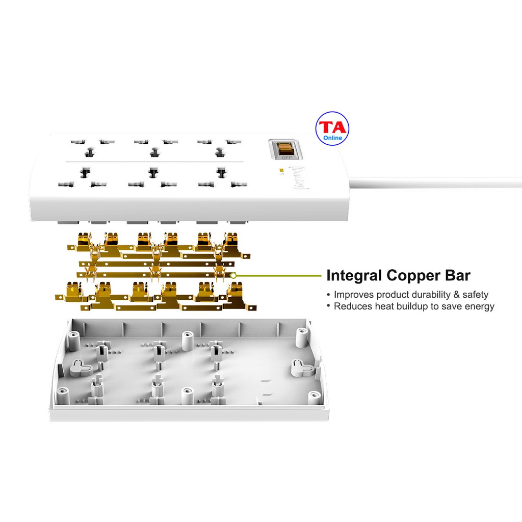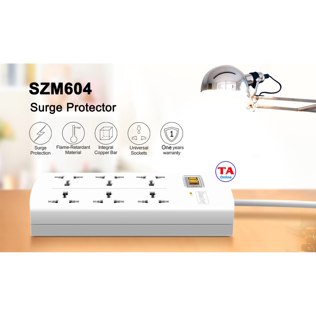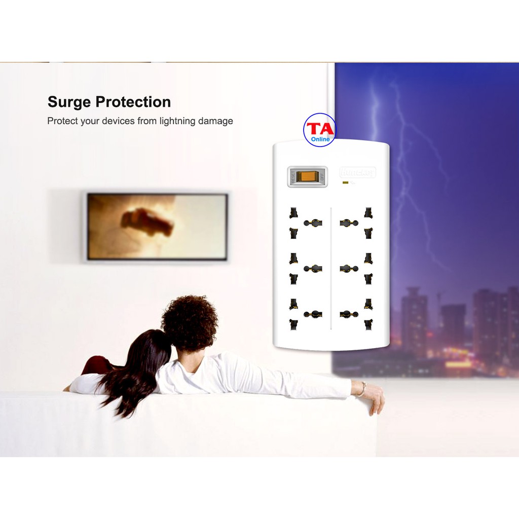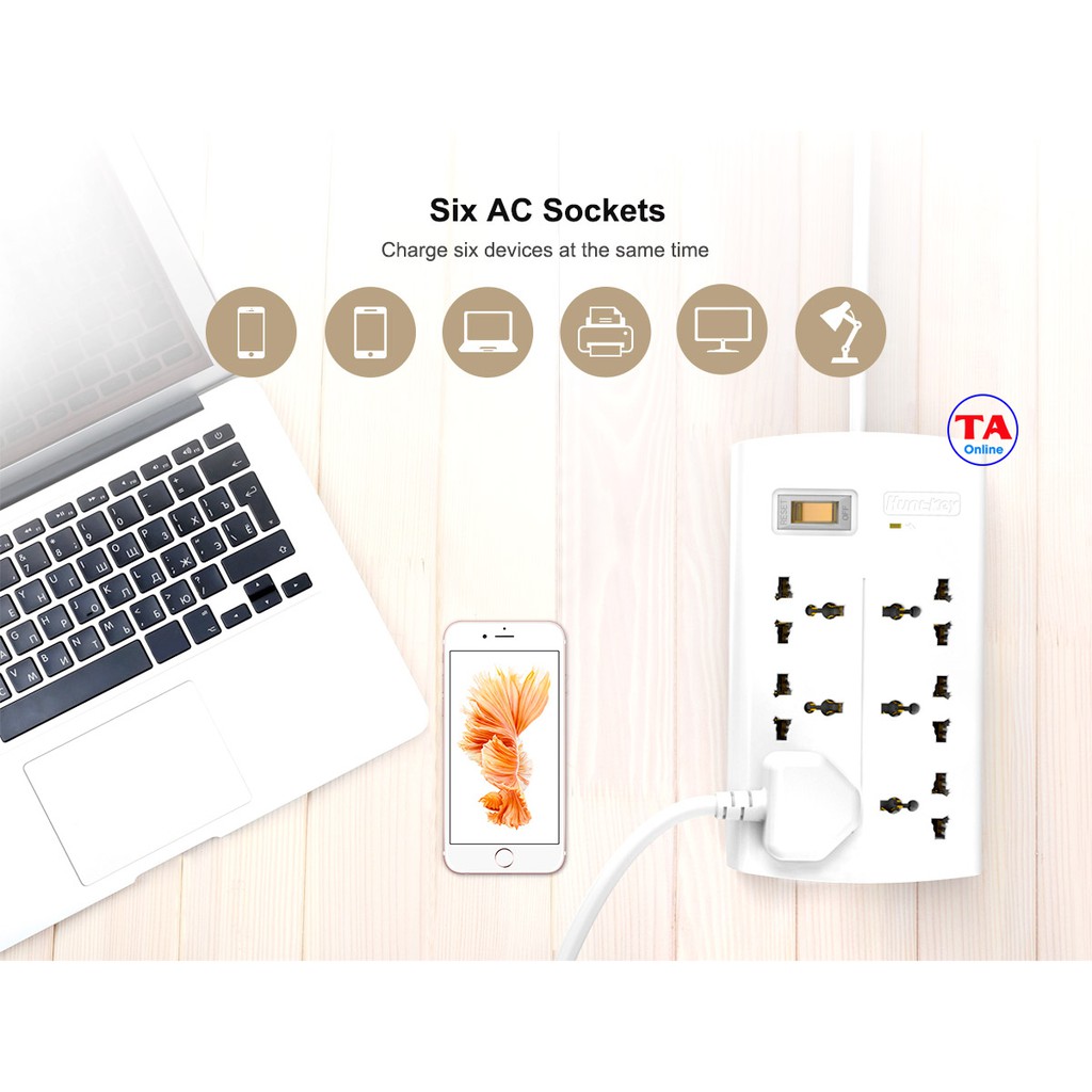 - 6 Ổ cắm đa năng chống sét, tương thích mọi loại phích cắm phổ biến.