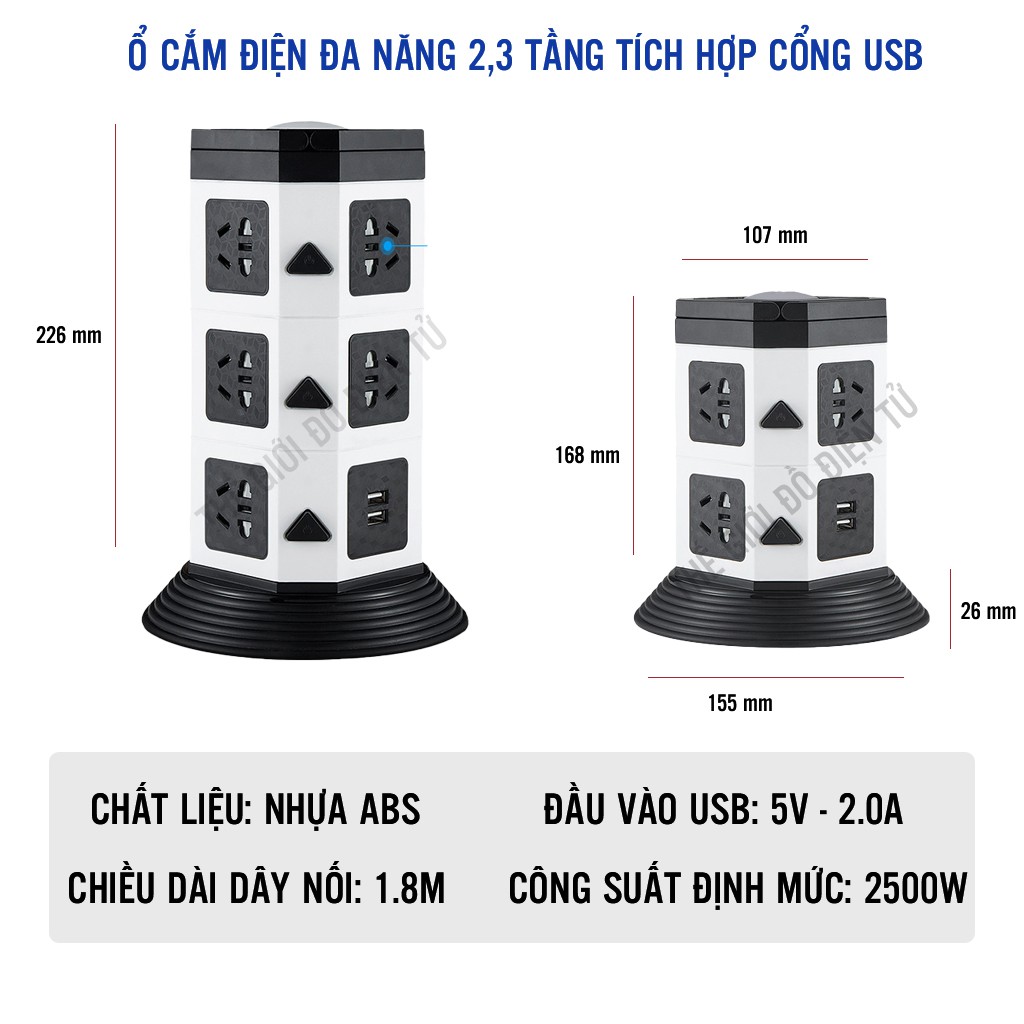 Ổ Cắm Điện Đa Năng 2/3 Tầng Socket 2 Cổng Usb, Ổ Điện Chụi Tải 2500W Dây Nối Dài 1,8m An Toàn Sử Dụng - Tặng Kèm Chân Chuyển Đổi- Ổ Cắm Điện siêu bền chống giật trang bị công tắc chống quá tải loại 2 tầng
