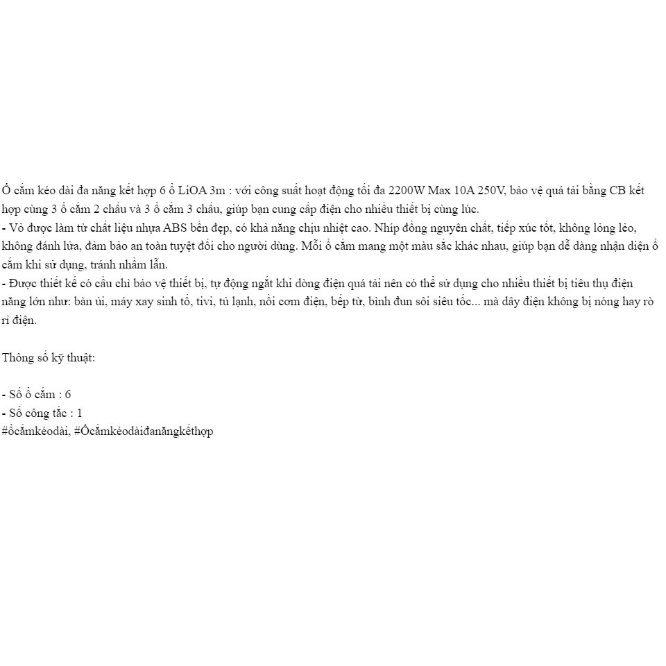 Ổ cắm LIOA kéo dài đa năng kết hợp (Đen) với công suất hoạt động tối đa 2200W Max 10A 250V, bảo vệ quá tải bằng CB kết hợp cùng 3 ổ cắm 2 chấu và 3 ổ cắm 3 chấu, giúp bạn cung cấp điện cho nhiều thiết bị cùng lúc. Vỏ được làm từ chất liệu nhựa ABS bền đẹp, có khả năng chịu nhiệt cao. Lỗ cắm bằng đồng nguyên chất, tiếp xúc tốt, không lỏng lẻo, không đánh lửa, đảm bảo an toàn tuyệt đối cho người dùng.