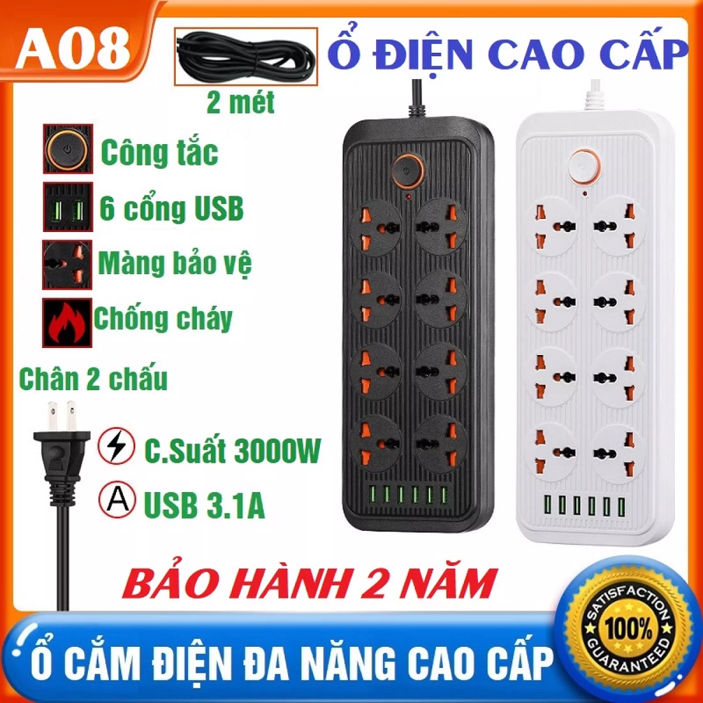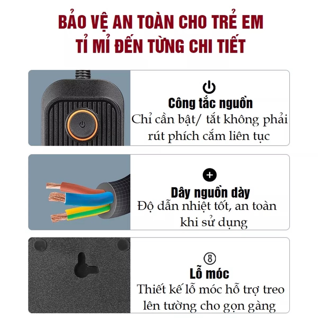Ổ Cắm Điện Đa Năng chịu Tải 3000W, 2 Nồi Lẩu, Nồi Chiên Không Dầu, Thiết Kế An Toàn Chống Cháy Chống Giật Có 6 Cổng USB
