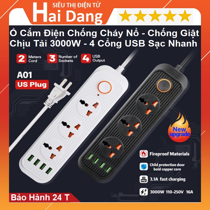Ổ Cắm Điện Đa Năng Chống Cháy Nổ A01, Chống Giật - Kiêm 4 Cổng USB Sạc Nhanh QC3.0 - Chịu Tải 3000W - Bảo Hành 24 Tháng