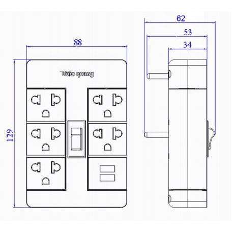 - Ổ cắm chia thành 5 lỗ cắm và 2 cổng sạc USB nguồn 5V- 2A, rất tiện lợi khi sử dụng trong không gian hẹp để sạc điện thoại, loa bluetooth, máy tính bảng và cắm nhiều các thiết bị điện khác mà không tốn diện tích.