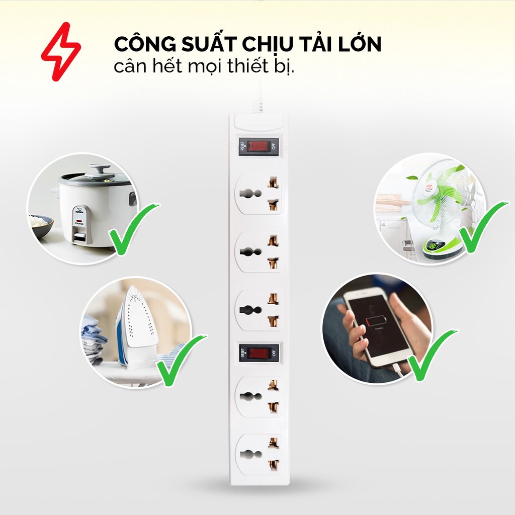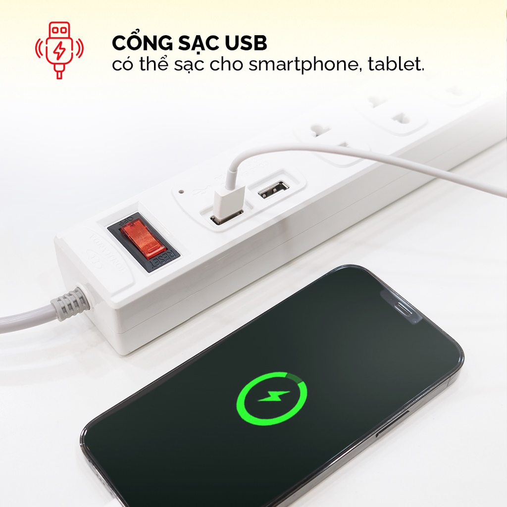 Phân loại:0114R-U3: 4 lỗ cắm, 2 cổng USB, 1 công tắc Reset, công suất tối đa 2.500W
