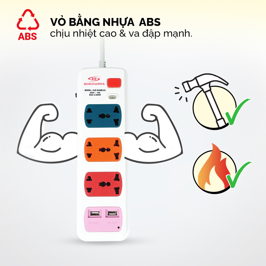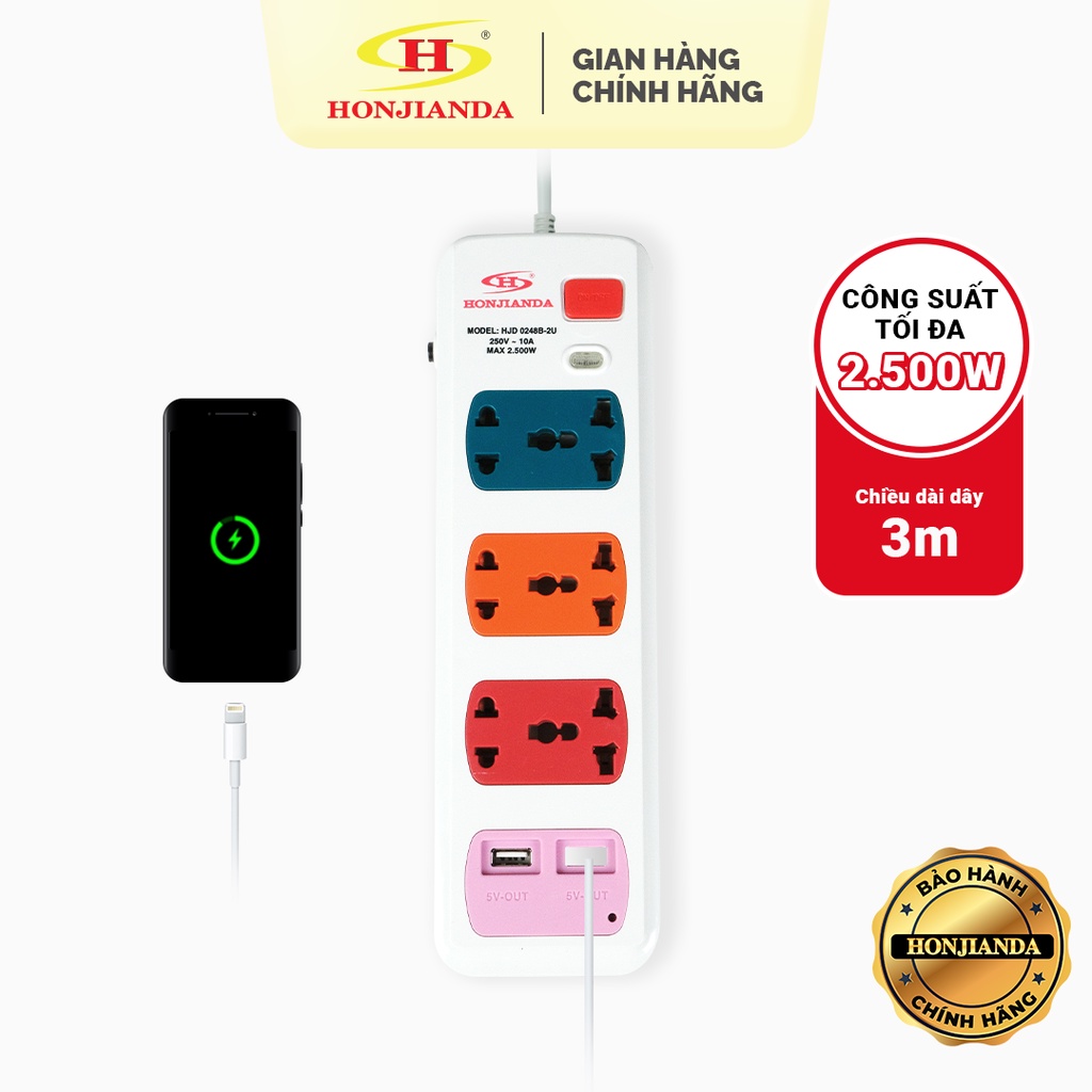 Giới thiệu Ổ cắm điện đa năng Có USB Honjianda Mã 02 Dây 3m - an toàn chống quá tải