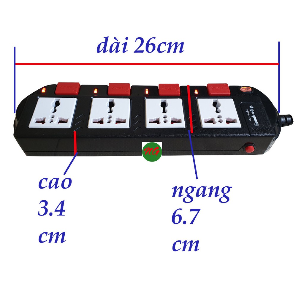 - Số ổ cắm: 4 ổ cắm 3 chấu đa năng (cắm được các loại phích cắm phi 4, phi 5, dẹp, 3 chân thẳng nhỏ... )