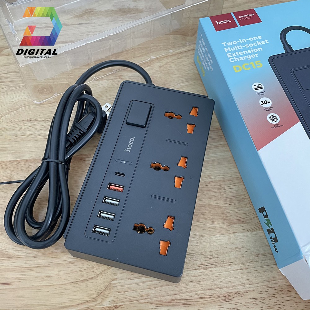 Ổ Cắm Điện Đa Năng Hoco DC15 Chính Hãng Có Cổng USB Thông MinhNếu muốn sở hữu một ổ cắm thông minh chống cháy nổ, chập điện hiệu quả sao bạn không thử ổ cắm điện đa năng có 5 cổng USB Hoco DC15 chính hãng.