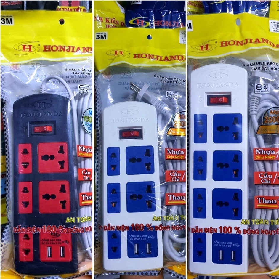 Ổ Cắm Điện Đa Năng Honjianda Mã 04 6A/10A Có USB Dây 3m/5m