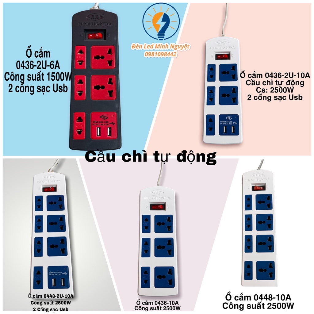 Phân Loại: Đều có cầu chì tự động0436-2U-6A: có 2 cổng sạc, 5 lỗ cắm, công suất 1500W.