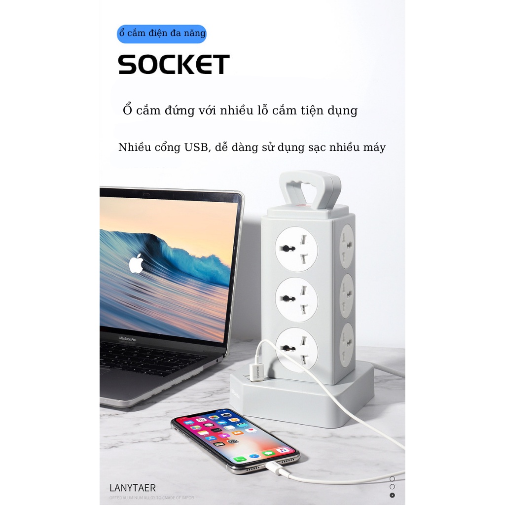 ĐẶC ĐIỂM :Ổ cắm điện đa năng nhiều lỗ cắm hình tháp an toàn chống giật, cháy nổ, chịu tải 2500w