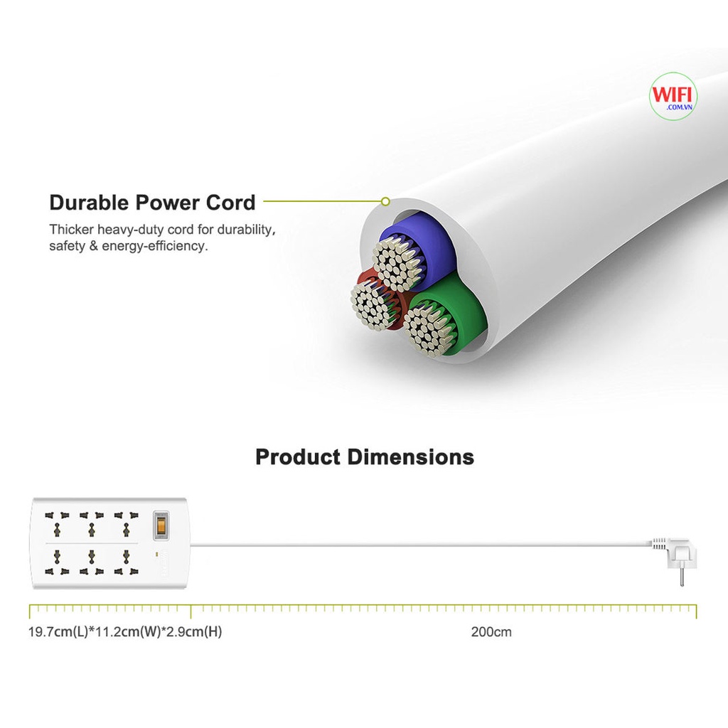 Dây điện chắc chắn - Dây diện dầy giúp tăng độ bền, độ an toàn và tiết kiệm điện. Kích thước ổ cắm 19.7cm(Dài) x 11.2cm (Rộng) x 2.9cm (Cao) với cáp dài 3 mét