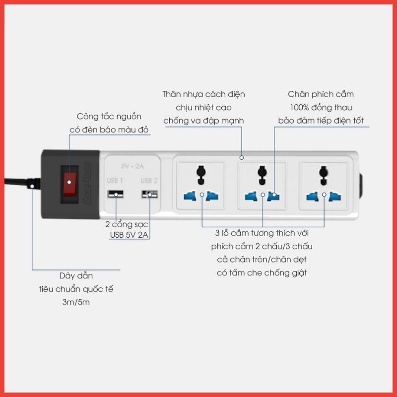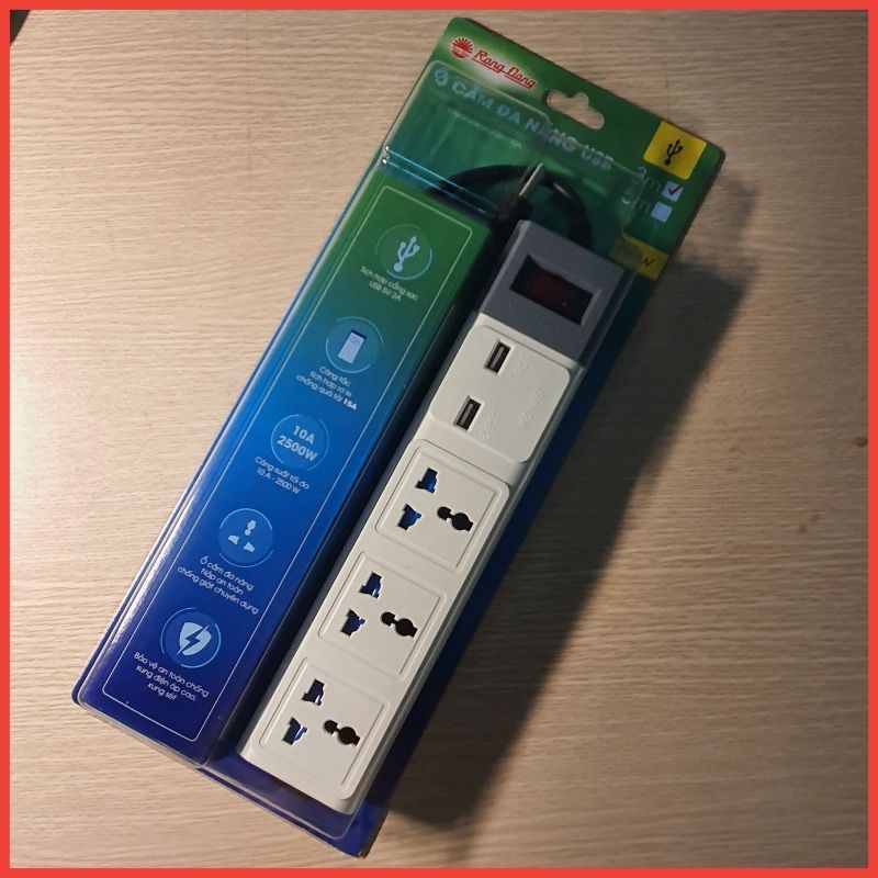 Giới thiệu Ổ Cắm Điện Đa Năng Rạng Đông 2 Cổng USB, Sạc Nhanh 5V-2A, Ổ Điện Chịu Tải 2500W, Tích Hợp Rơ Le Tự Ngắt, Dây Nối Dài 3M
