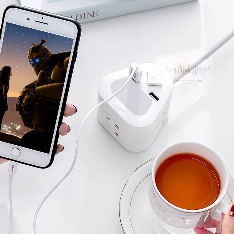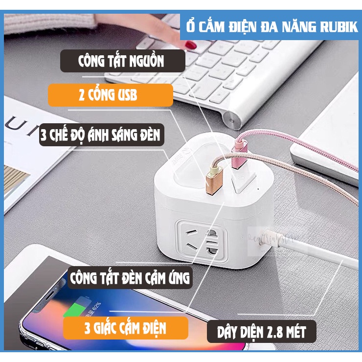 1./ Thông tin sản phẩm: Ổ cắm điện đa năng RUBIK kết hợp cảm ứng ánh sáng, 2 cổng USB, 3 ổ cắm điện, dây điện 2,8m- Chất liệu: nhựa PC chống cháy 750 độ