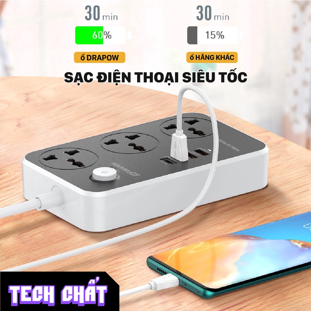 Ổ cắm điện đa năng SIÊU TẢI DRAPOW SK20 3000W dây 2m chống cháy giật - Sạc nhanh USB C 20W PD + 3 cổng QC 3.0 18W