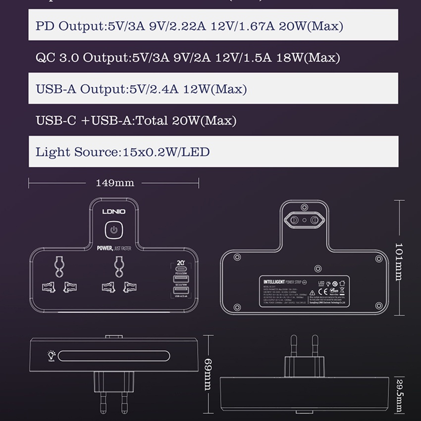 Ổ cắm điện đa năng thông minh ,Ổ chuyển đổi USB với chân PD sạc nhanh 20W , Đèn ngủ cảm ứng tự động - LDNIO*Thông số kỹ thuật