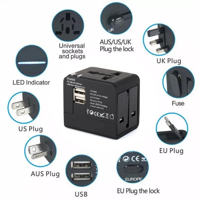 - Ổ cắm điện đa năng: có phích cắm chuyển đổi kết hợp đa chức năng, được chia thành nhiều tiêu chuẩn chân cắm, bao gồm Anh, Mỹ, Úc, Châu Âu, Châu Á