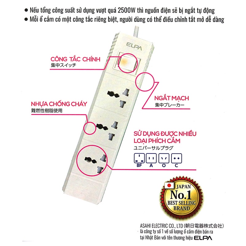 Thiết Bị Điện Gia Dụng > Mạch điện & Phụ tùng > Ổ cắm điện & Dây nối || Ổ CẮM ĐIỆN ELPA ESL-VNC33 3 Ổ ĐIỆN 1 CÔNG TẮC 3M - HACHI HACHI JAPAN SHOPCòn hàng