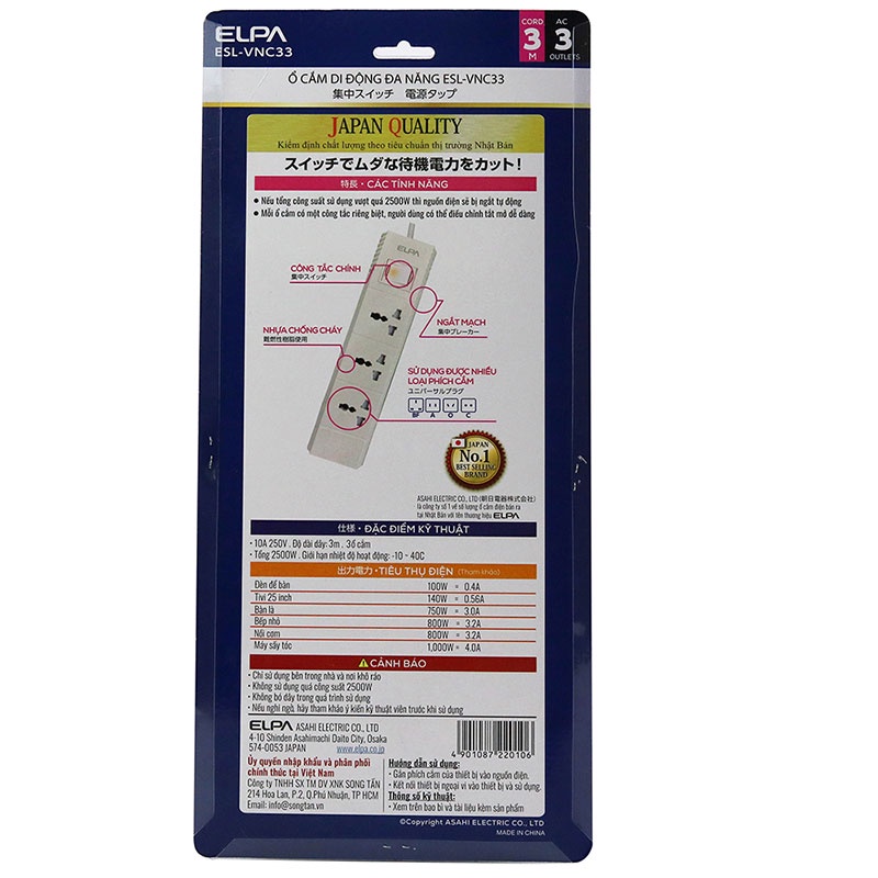 Ổ CẮM ĐIỆN ELPA ESL-VNC33 3 Ổ ĐIỆN 1 CÔNG TẮC 3M - HACHI HACHI JAPAN SHOP