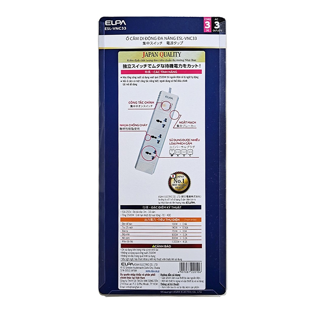 Thiết Bị Điện Gia Dụng > Mạch điện & Phụ tùng > Ổ cắm điện & Dây nối || Ổ cắm điện ELPA ESU-VNC33Còn hàng