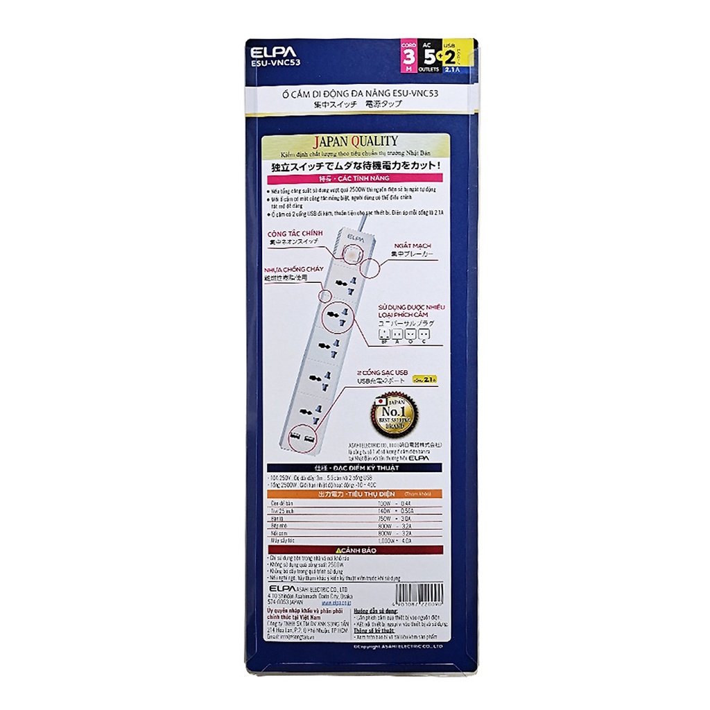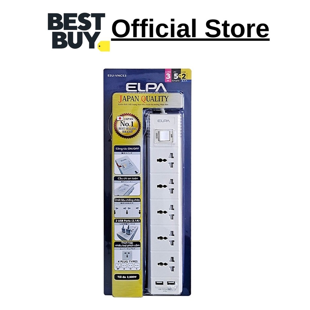 Giới thiệu Ổ CẮM ĐIỆN ELPA ESU-VNC53 (5 way, 1 switch, 3m; 2xUSB)