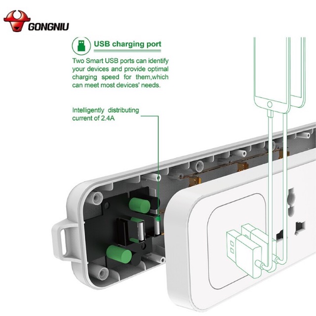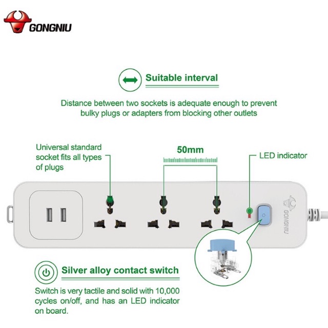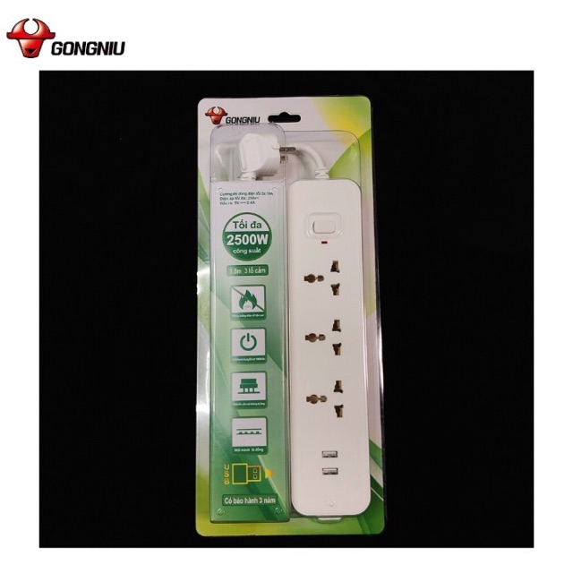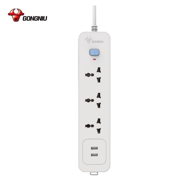 Thiết Bị Điện Gia Dụng > Mạch điện & Phụ tùng > Ổ cắm điện & Dây nối || Ổ Cắm Điện Gongniu 3 Ổ Đa Năng + 2 USB 1 công tắc 2500W/10A Dây Dài 1.8M (N103U) - Chính HãngCòn hàng