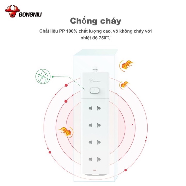 Ổ Cắm Điện Gongniu 4 Ổ 1 Công Tắc 2500W – Trắng – Chính Hãng – V1040Ổ cắm điện nối dài thế hệ mới - Hàng Gongniu phân phối chính hãng tại Vietnam.