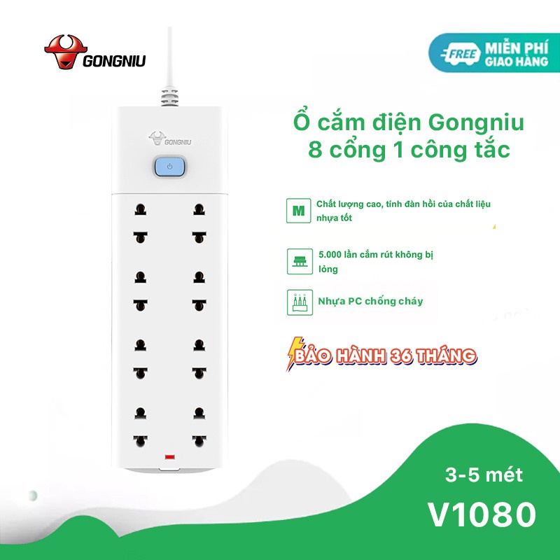 Thiết Bị Điện Gia Dụng > Mạch điện & Phụ tùng > Ổ cắm điện & Dây nối || Ổ cắm điện Gongniu 8 ổ 1 công tắc - 2500W 10A (V1080) - Chính HãngCòn hàng