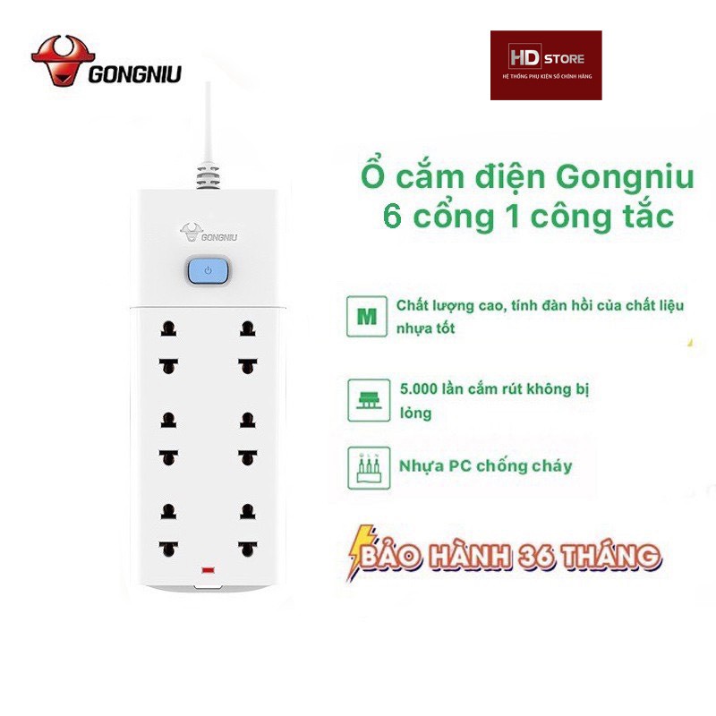 Giới thiệu Ổ cắm điện hãng GongNiu Bull 6 ổ 1 công tắc Công suất 2500W 10A Dây nối dài 3 Mét