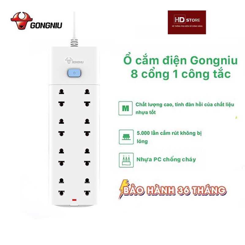 Ổ cắm điện đa năng GongNiu Bull 8 ổ 1 công tắc Công suất 2500W 10A Dây nối dài 3 Mét nhiều ổ