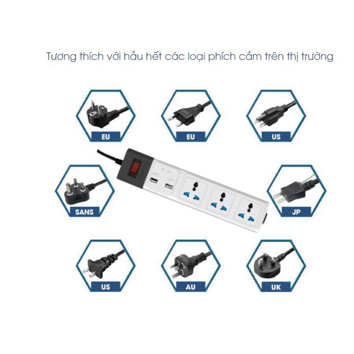 Mặt ổ cắm đa năng, phù hợp với hầu hết các loại phích cắm.