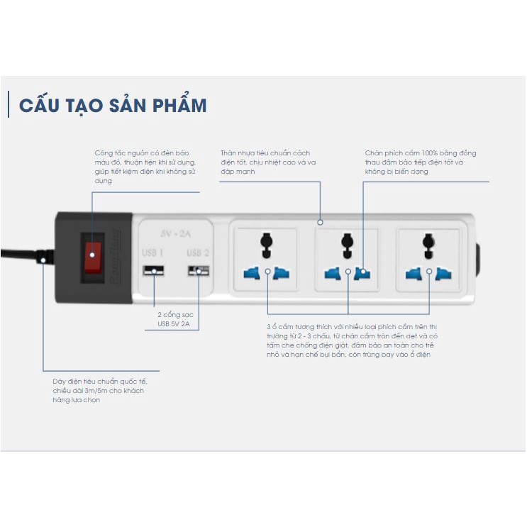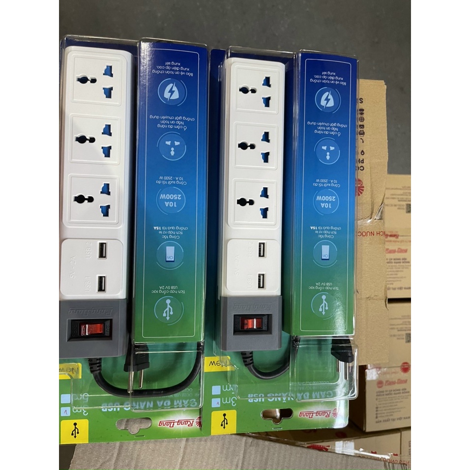 Giới thiệu Ổ cắm điện kéo dài đa năng Rạng Đông 3 ổ điện, 2 cổng USB, dây 3-5 mét chịu tải đến 2500W