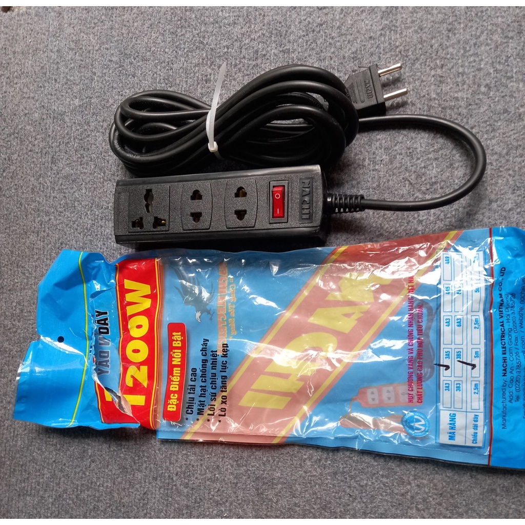 Thiết Bị Điện Gia Dụng > Mạch điện & Phụ tùng > Ổ cắm điện & Dây nối || Ổ cắm điện liền dây dài 5m chịu tải cao 3 lỗ 1 công tắc Nachi 1200W 3A5Còn hàng