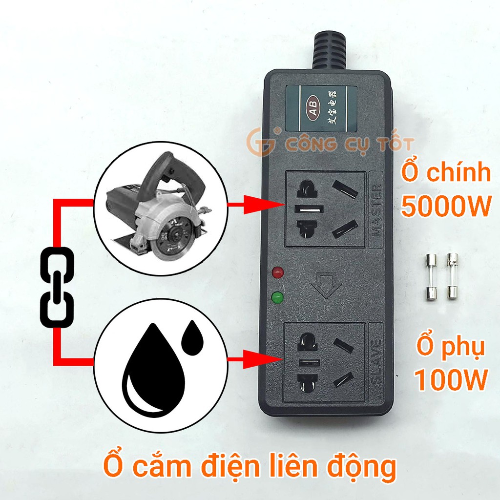Ổ cắm điện liên động chính 5000W phụ 100W hoạt động theo nguyên tắc phát hiện dòng điện tiêu thụ của máy chính để bật tắt máy phụ. Sản phẩm dùng cho máy khoan cắt có yêu cầu liên động với máy bơm mini hoặc đèn chiếu sáng