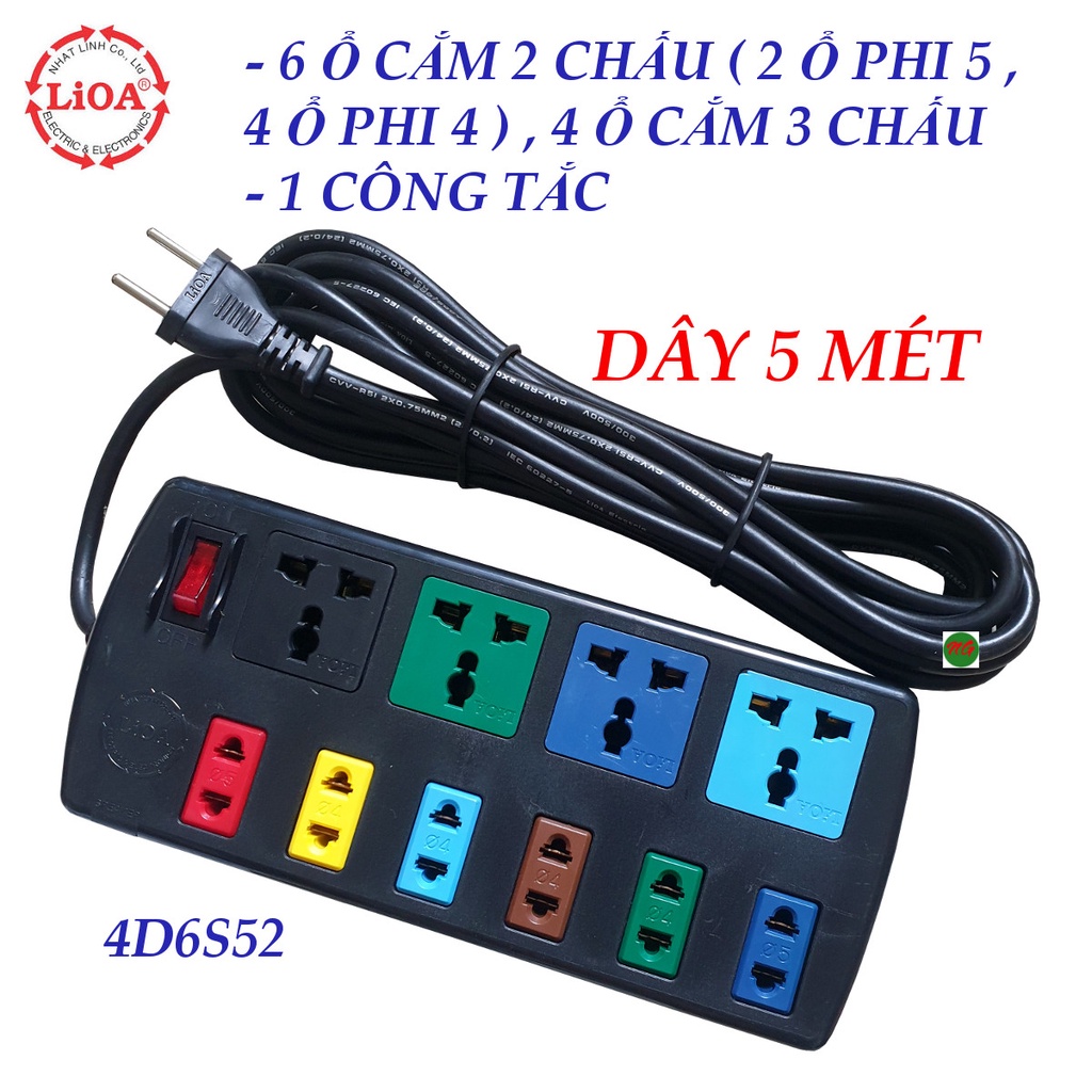 Giới thiệu Ổ cắm điện LIOA 10 ổ cắm dây 5 mét 4D6S52 (Đen) - bảo hành 01 năm