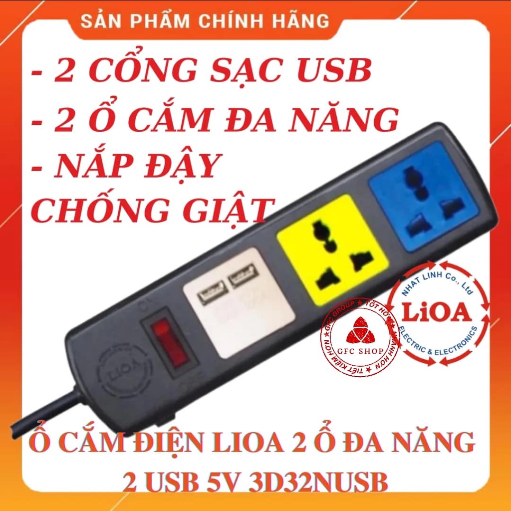Thiết Bị Điện Gia Dụng > Mạch điện & Phụ tùng > Ổ cắm điện & Dây nối || Ổ cắm điện Lioa 2 ổ đa năng - 2 cổng sạc USB 5V-1A model 3D32NUSB 1 công tắc nắp che chống giậtCòn hàng