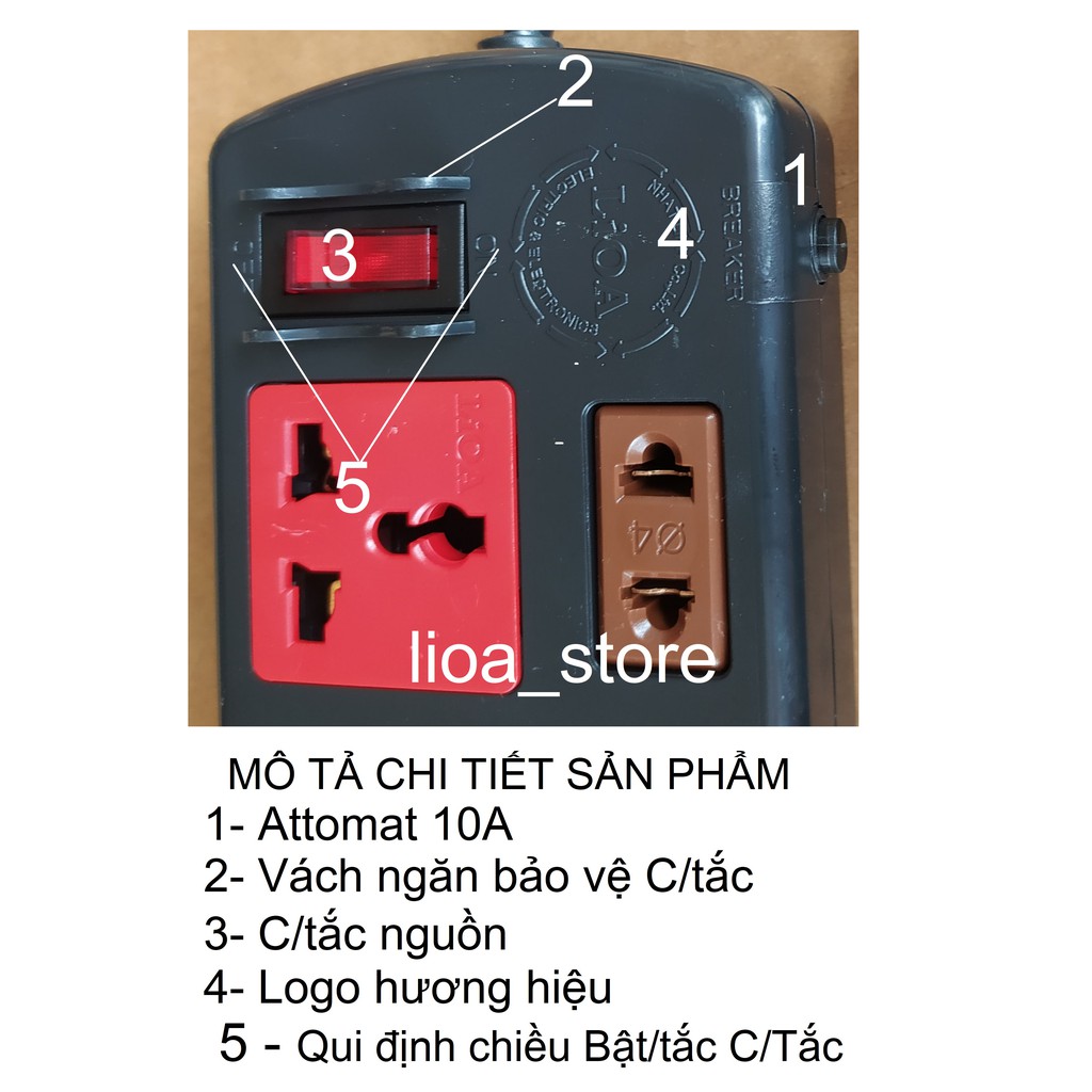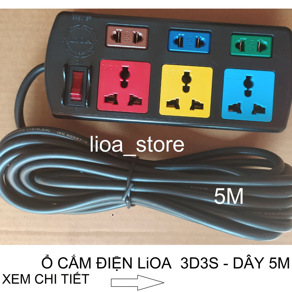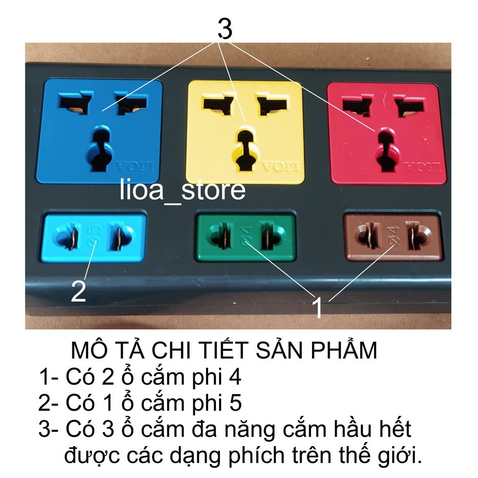 -Thân ổ cắm màu đen. Mỗi ổ cắm mang 1 màu sắc khác nhau giúp cho người sử dụng phân biệt dễ ràng khi dùng nhiều thiết bị cùng 1 lúc. trên mỗi mặt nắp nhựa ổ cắm đều có chữ LiOA. ( để tránh hàng giả hàng nhái).ĐẶC BIỆT hơn là trên mỗi Ổ CẮM 2 CHẤU CÓ GHI RÕ Ổ NÀO DÙNG. phích PHI 4 .và phi 5 . MUCHJ ĐÍCH . tránh trường hợp dùng phích phi 4 cắm vào ổ phi 5 và phi 5 lại cắm vào ổ phi 4 thì đều cho ta 1 kết quả là tiếp xúc ko tốt, và sẽ bị đánh lửa sinh nhiệt tại ổ dễ gây cháy.