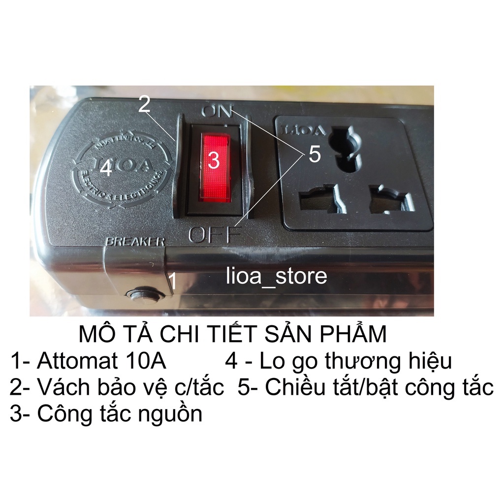 -Thân ổ cắm màu đen . có gắn thương hiệu LiOA . Mỗi ổ cắm mang 1 màu sắc khác nhau giúp cho người SD phân biệt dc dễ ràng khi dùng nhiều thiết bị cùng 1 lúc. trên mỗi mặt nắp nhựa ổ cắm đều có chữ LiOA. ( để tránh hàng giả hàng nhái).ĐẶC BIỆT là các ổ cắm dều có nắp che AN TOÀN . ( tránh trường hợp nhà có trẻ con vô ý thò tay vào ổ cắm khi đang có điện . khoảng cách giữa các ổ là đảm bảo cắm dc các phích có bản to.