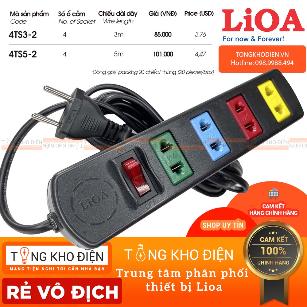 Ổ cắm điện LIOA, 4 lỗ, có công tắc, ~1000W, dây dài 3m/5m, mã: 4TS