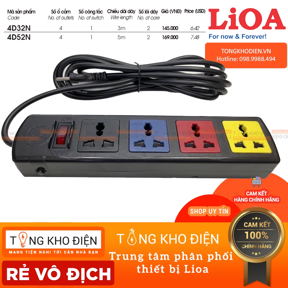 Giới thiệu Ổ cắm điện LIOA, 4 lỗ đa năng, có công tắc, có bảo vệ quả tải, 3300W, dây dài 3m/5m, mã: 4D