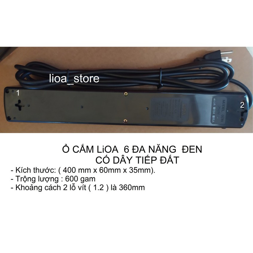 - * MỤC ĐÍCH : Ổ CẮM ĐIỆN LiOA 6 ĐA NĂNG CÓ DẤY TIẾP ĐẤT dùng để CHỐNG RÒ ĐIỆN và chiệt tiêu dòng cảm ứng của cấc thiệt bị văn phòng, các thiết bị trong sinh hoat nơi cộng cộng,trong gia đình và các lĩnh vực khác trong cuộc sống .....THÔNG SỐ KỸ THUẬT