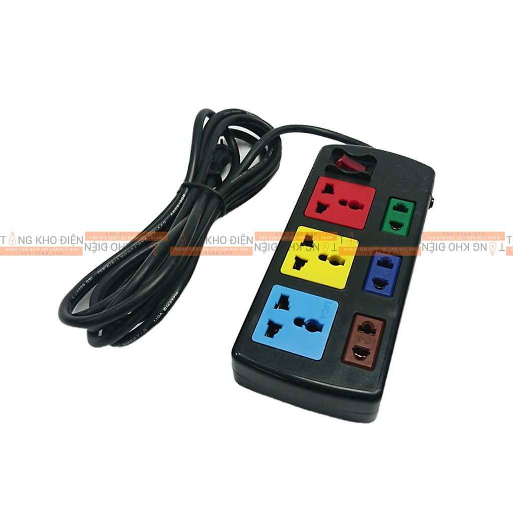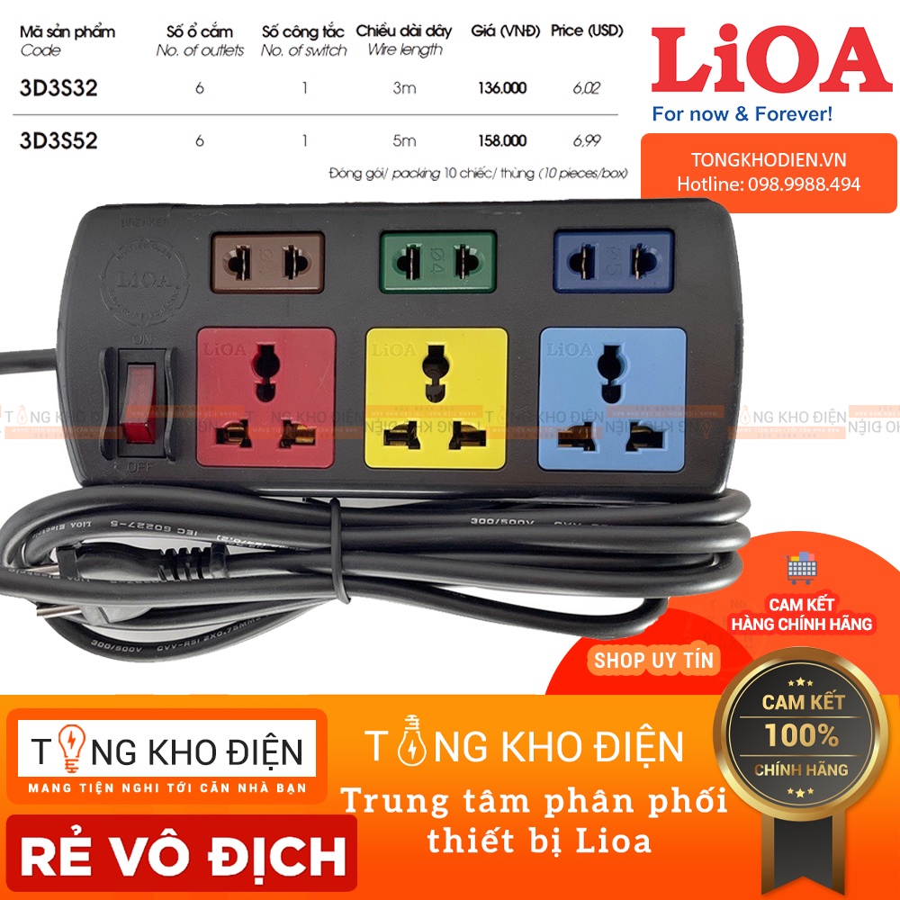 Thiết Bị Điện Gia Dụng > Mạch điện & Phụ tùng > Ổ cắm điện & Dây nối || Ổ cắm điện LIOA, 6 lỗ, có công tắc, có bảo vệ quá tải, ~2200W, dây dài 3m/5m, mã: 3D3SCòn hàng