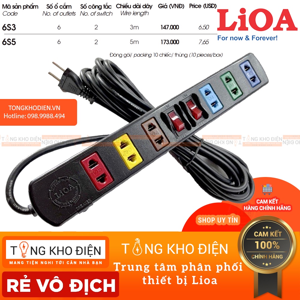 Giới thiệu Ổ cắm điện LIOA, 6 lỗ, có công tắc, có bảo vệ quá tải ~2200W, dây dài 3m/5m, mã: 6S