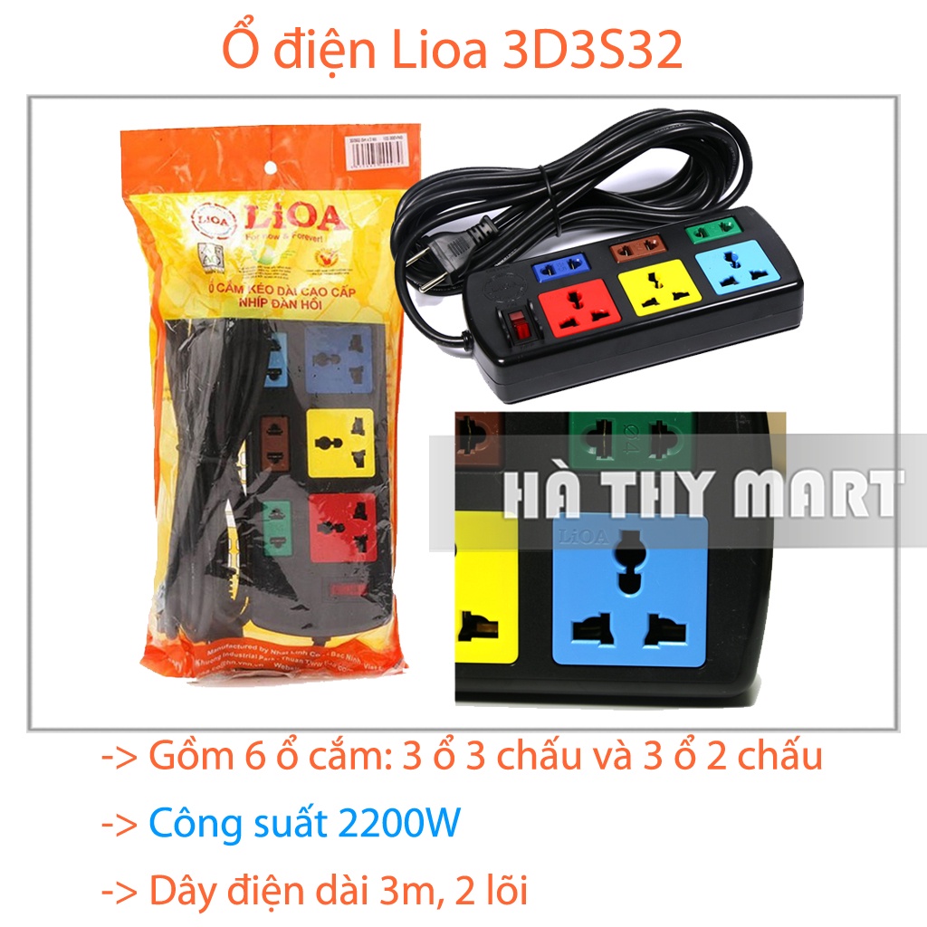 - Ổ cắm điện đa năng Lioa 3D3S52 (dây dài 5 mét) sẽ giúp bạn cung cấp điện cho nhiều thiết bị cùng lúc. 06 lỗ cắm giúp bạn có thể cho 06 thiết bị điện hoạt động tiện lợi. 3 chấu đa năng giúp phù hợp với mọi loại phích cắm có trên thị trường. Công tắc điện giúp bạn linh hoạt ngắt/mở điện cho toàn bộ ổ điện. Breaker giúp bảo vệ quá tải cho ổ điện. Chất liệu nhựa chịu nhiệt cao cấp đem lại sự an toàn cho người sử dụng.