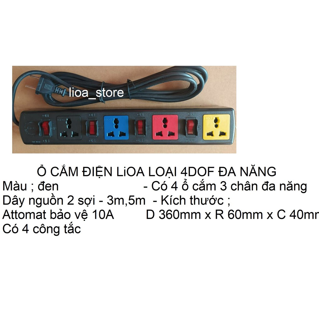 -- Ổ cắm dân dụng Lioa 4DOF-10A là loại ổ cắn có 4 ổ Đa năng cắm được hầu hết các kiểu phích trên thế giớ ( cắm phích 3 chân kiểu ANH, MĨ,, ÚC NHẬT.... kiểu.2 chân ( TRÒN VÀ DẸT dc thiết kế ĐỘC ĐÁO với 4 công tắc tương ứng với 4 ổ cắm tạo nên sự khác biệt vs ổ cắm thông dụng khác. mẫu mã đep.và sang trọng tiện lợi cho người SD, vỏ dc làm bằng nhựa ABS có khả năng chịu nhiệt cao,chịu va đập tác động bên ngoài,.NHÍP ĐỒNG bên trong dc chế tạo từ đồng đàn hồi nhập khẩu, tiếp xúc tốt ko lỏng lẻo,ko đánh lửa đảm bảo AN TOÀN tuyệt đối cho người sử dụng.