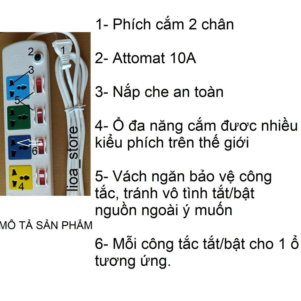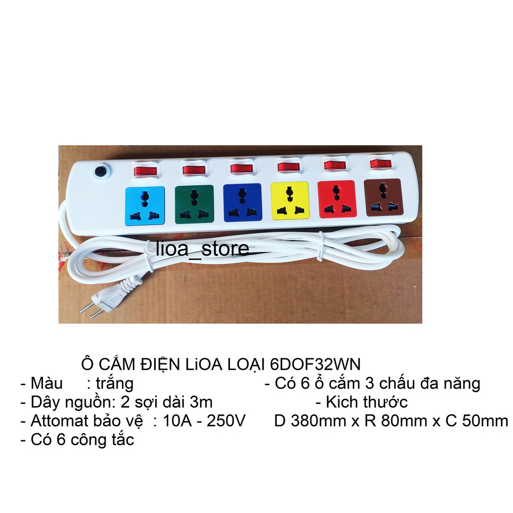 -- Ổ cắm dân dụng Lioa 6DOF32WN-10A là loại ổ cắn có 6 ổ Đa năng cắm dc hầu hết các kiểu phích trên thế giớ ( cắm phích 3 chân kiểu ANH, MĨ,, ÚC NHẬT.... kiểu.2 chân ( TRÒN VÀ DẸT dc thiết kế ĐỘC ĐÁO với 6 công tắc tương ứng với 6 ổ cắm tạo nên sự khác biệt vs ổ cắm thông dụng khác. mẫu mã đep.và sang trọng tiện lợi cho người SD, vỏ dc làm bằng nhựa ABS có khả năng chịu nhiệt cao,chịu va đập tác động bên ngoài,.NHÍP ĐỒNG bên trong dc chế tạo từ đồng đàn hồi nhập khẩu, tiếp xúc tốt ko lỏng lẻo,ko đánh lửa đảm bảo AN TOÀN tuyệt đối cho người SD.