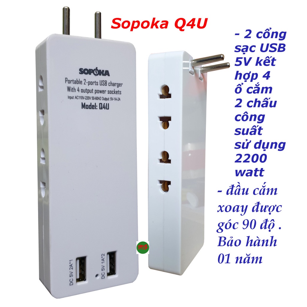 *THÔNG TIN SẢN PHẨM:Sạc 2 cổng USB 5V-2A tích hợp 4 ổ cắm điện 2 chấu SOPOKA Q4U là sản phẩm có thiết kế độc đáo, nhỏ gọn, tinh tế gồm: