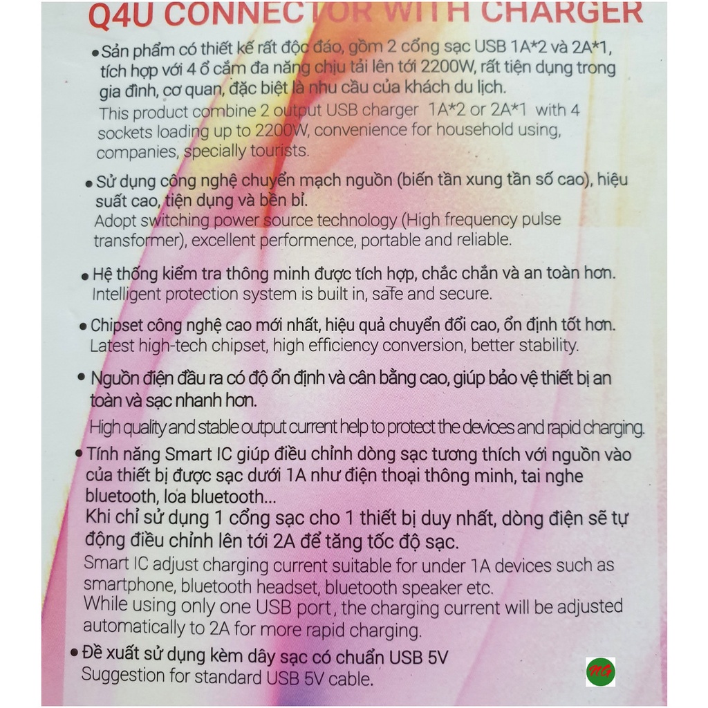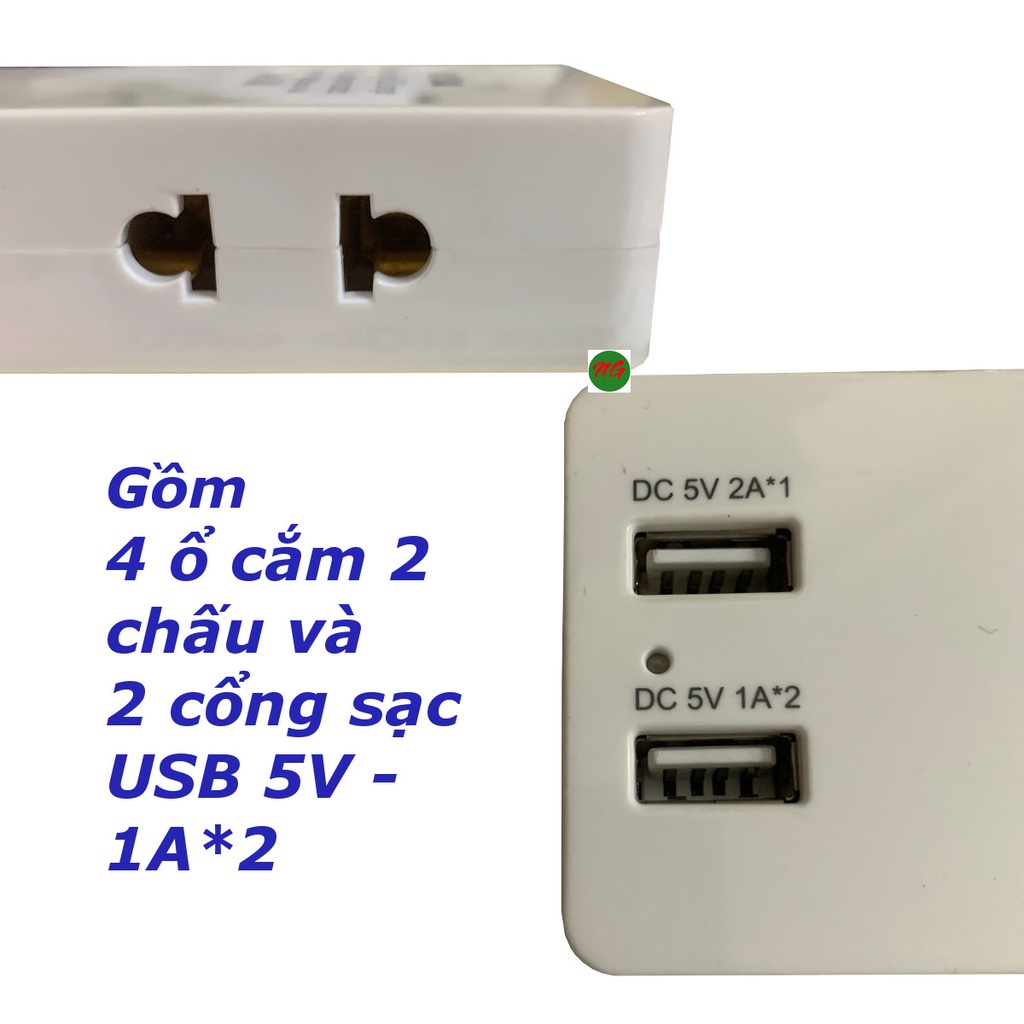 Sản phẩm có thể được xem như là 1 phích cắm chia 4 ngõ có tích hợp thêm 2 cổng sạc USB 5V