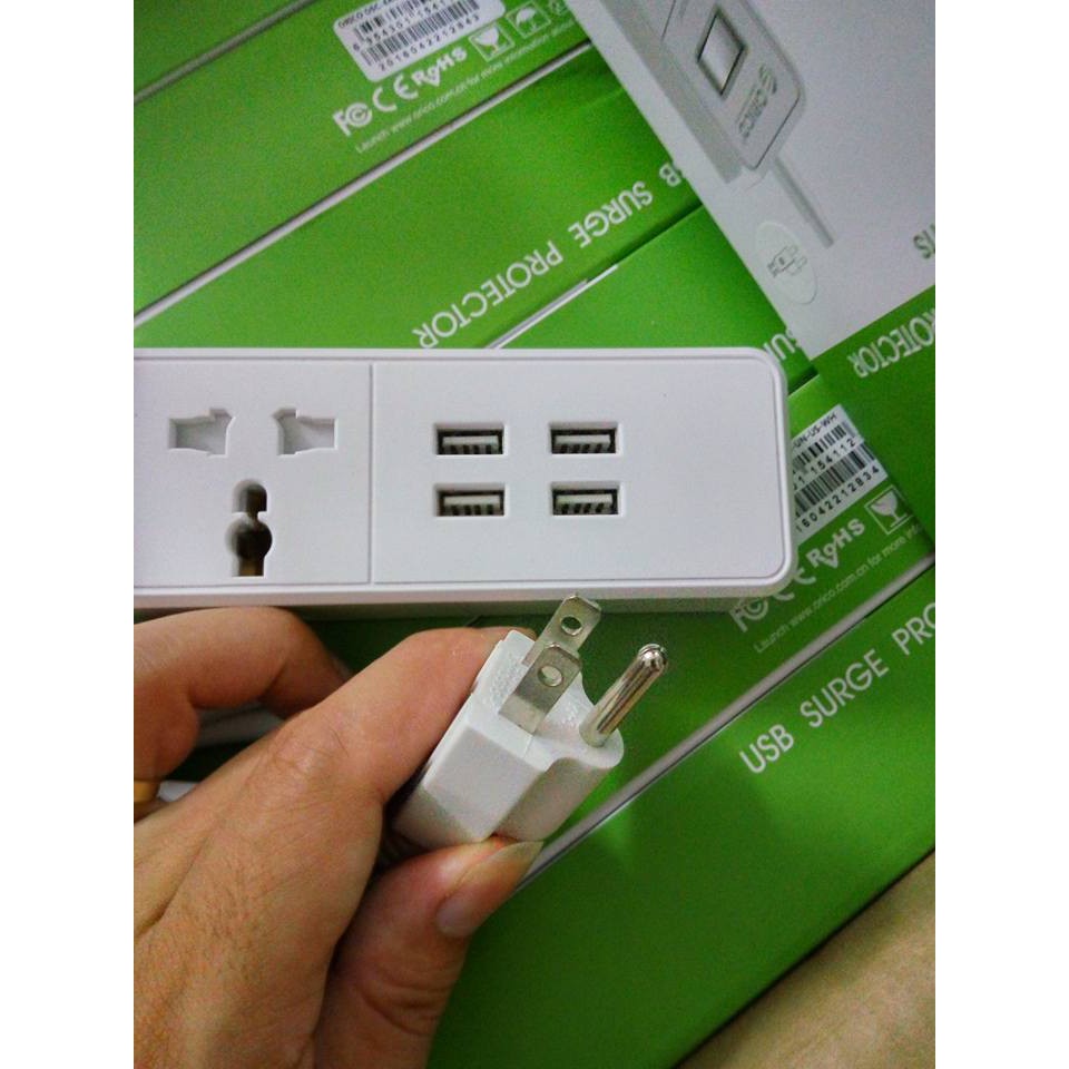 Ổ cắm điện 4 lỗ cắm 3 chấu, tích hợp 4 cổng sạc USB 2.4AĐầu vào: Điện thế 100-240V. Cáp điện dài 1,5m.