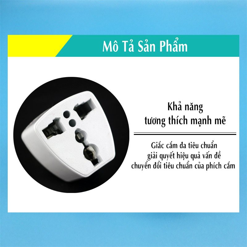 Hiện nay trên thế giới có hàng trăm loại phích cắm và ổ cắm khác nhau. Chắc hẳn trong bất cứ gia đình nào cũng đã từng gặp kiểu phích cắm đôi khi là chân tròn, chân dẹt, loại 3 chấu, 2 chấu… Để phù hợp với các loại thiết bị mà không cần phải thay đổi phích cắm. Phích cắm chuyển ra đời nhằm đáp ứng nhu cầu cho mục đích đó. Đặc điểm của phích cắm chuyển đổi này là có 1 đầu cắm đa năng, có thể phù hợp với rất nhiều loại phích cắm có chân khác nhau.THÔNG TIN SẢN PHẨM: