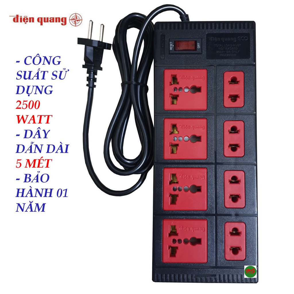 Giới thiệu Ổ cắm ĐIỆN QUANG 8 ổ cắm 2 Mét ESK2BR ( Đen phối đỏ)