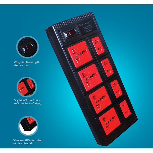- Số ổ cắm: 5 ổ cắm 3 chấu đa năng (cắm được các loại phích cắm phi 4, phi 5, dẹp, 3 chân thẳng nhỏ... )